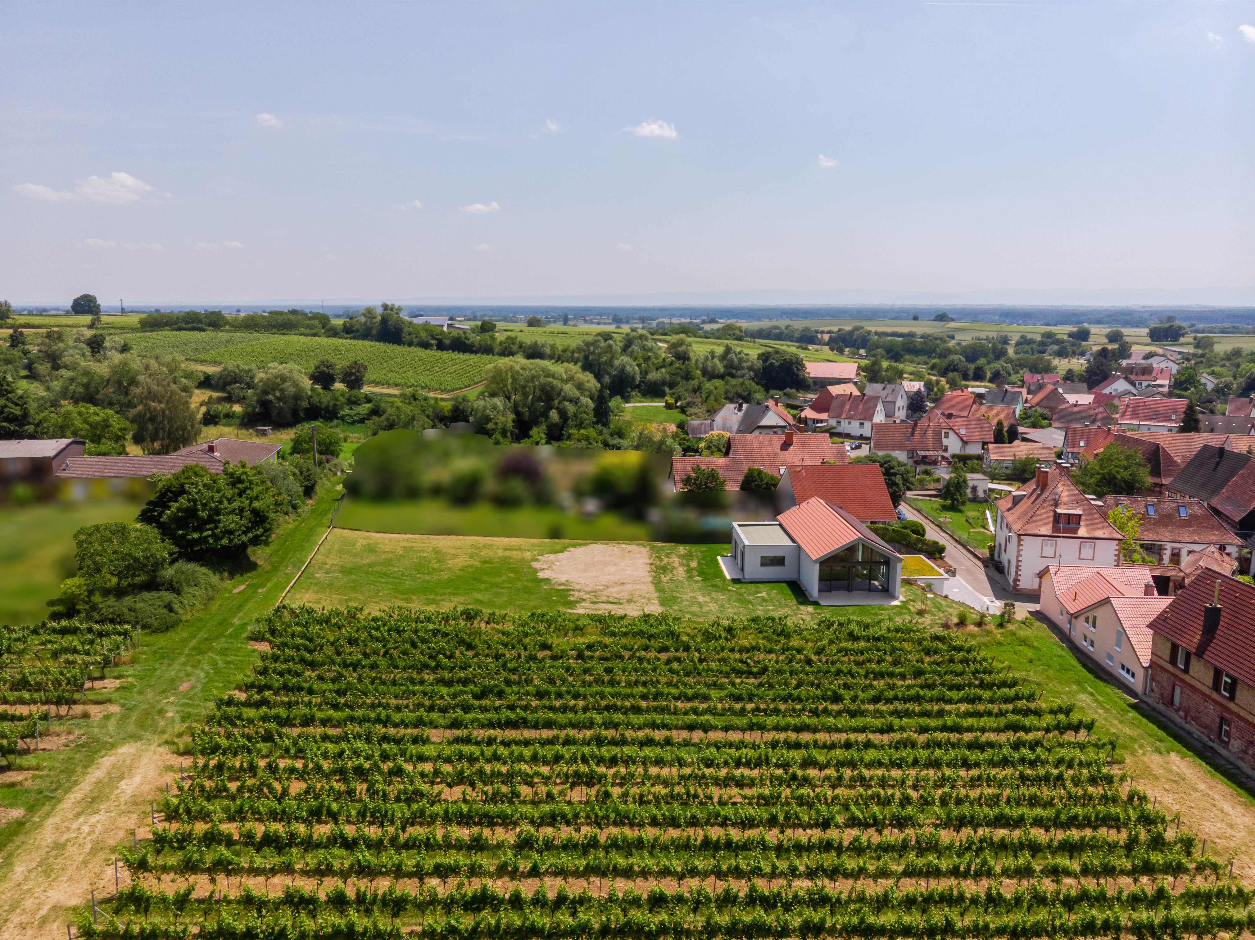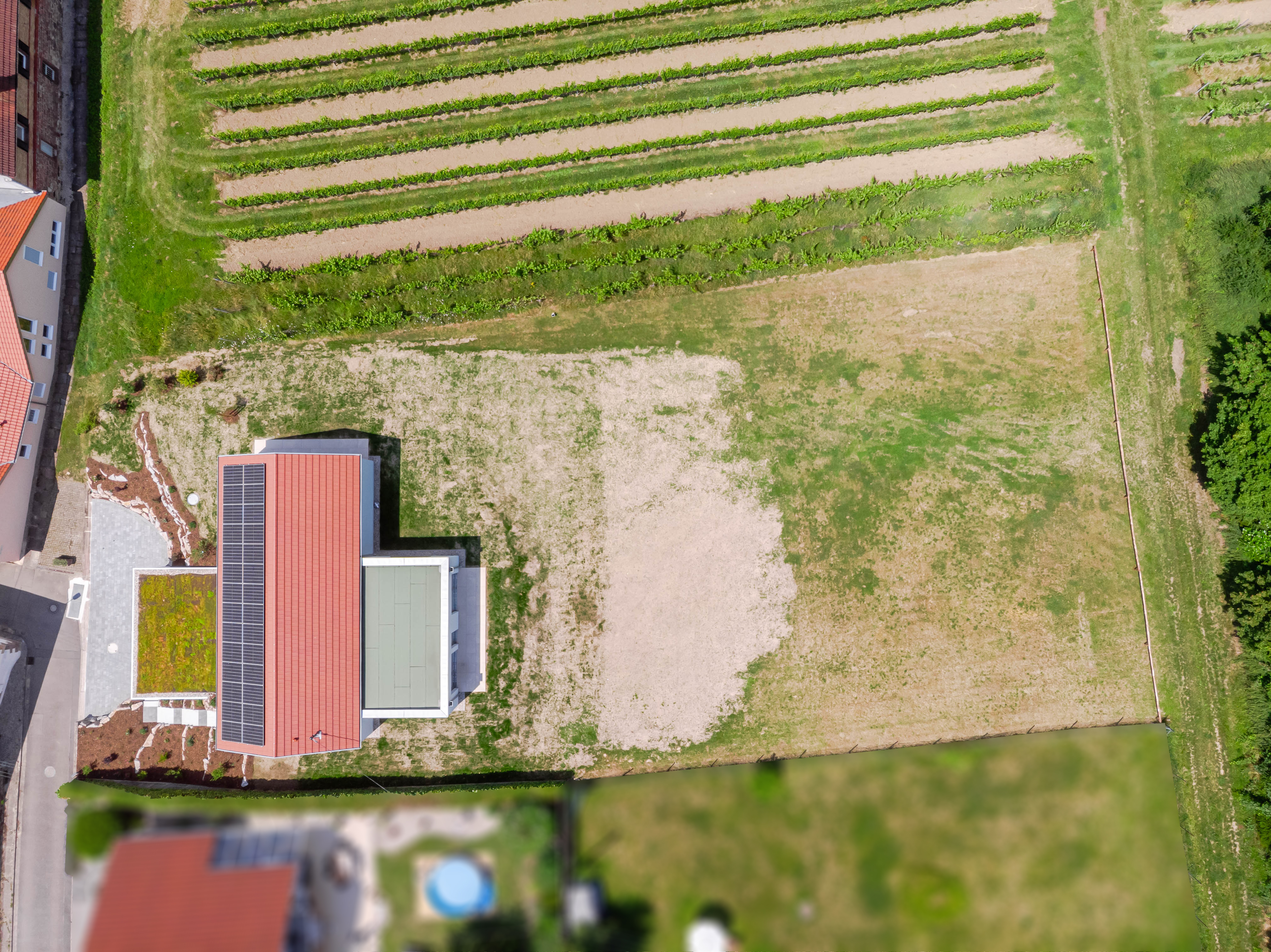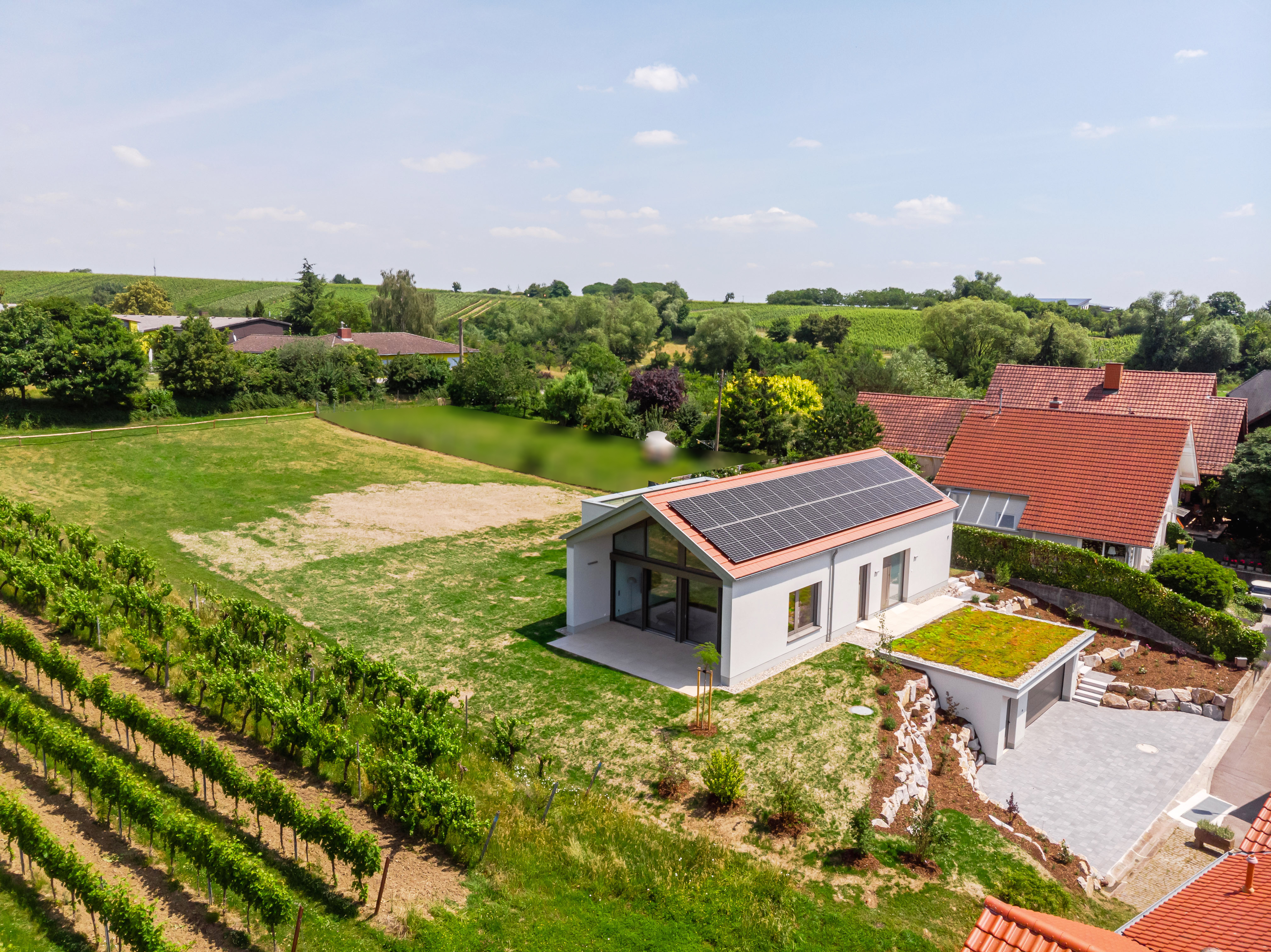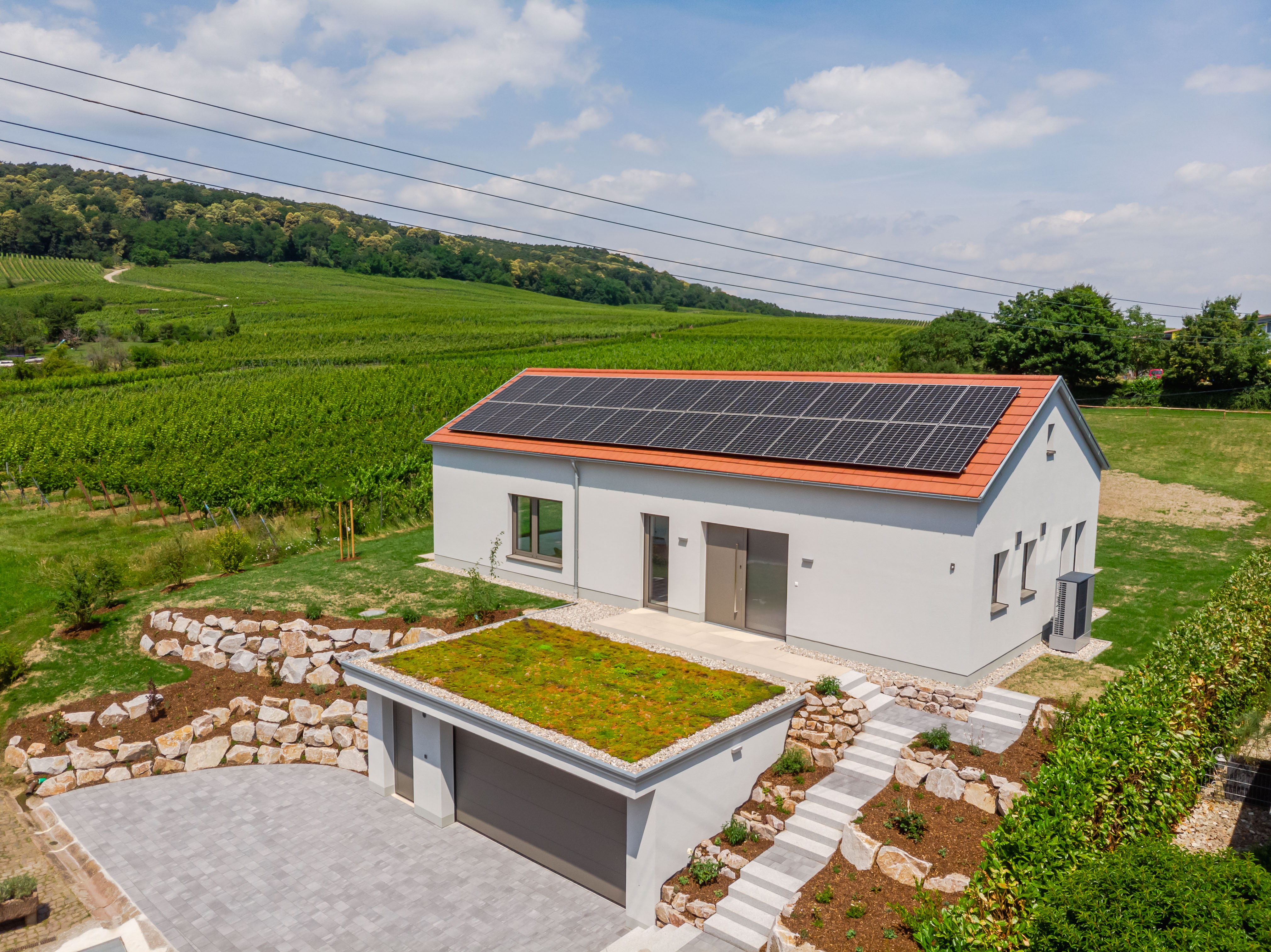 In absolut ruhiger und idyllischer Feldrandlage bietet Ihnen dieser exklusive Neubau-Bungalow die perfekte Symbiose aus moderner Architektur, energieeffizienter Bauweise und hochwertiger Ausstattung. Geplant von renommierten Architekten und gebaut mit lokalen, zuverlässigen Baufirmen, lässt diese Immobilie keine Wünsche offen und entspricht selbst höchsten Erwartungen an Design und Wohnqualität. In einer kaum befahrenen Seitenstraße gelegen, bildet das ca. 1.890 m² große Grundstück in leichter Hanglage viel Platz & Möglichkeiten zur freien Entfaltung – Vorbereitungen für einen Pool sind beispielsweise bereits getroffen worden. Auch eine große Doppelgarage mit zusätzlicher Eingangstür und Vorbereitungen für einen Personenaufzug ist vorhanden, so eignet sich diese Immobilie zum Beispiel auch hervorragend für das barrierearme Wohnen im gehobenen Alter. Einzigartig an dieser Liegenschaft ist der nahtlose Übergang zu den Weinbergen und die grandiose Aussicht – diese können Sie aber nicht nur im Garten genießen! Ein architektonisches Highlight ist der verglaste Giebel mit großen Schiebetüren zur Terrasse hin. In Verbindung mit dem bis zum First hin geöffneten Dachraum, bietet sich ein außergewöhnlicher Raum zum Kochen, Essen und Wohnen mit einem herrlichen Blick ins Grüne und unvergleichlicher Atmosphäre. Die erstklassige Einbauküche mit modernster Technik (Kochfeldabzug von Berbel, Quooker Wasserhahn und Miele Einbaugeräten) lädt zu kulinarischen Genüssen ein und perfektioniert das offene Wohnkonzept zusammen mit dem Ess- und Wohnbereich – all das mit einer hinreißenden Aussicht auf die Weinberge und den Pfälzer Wald! Abgerundet wird der Wohnbereich mit einer großen, durch das vorgezogene Satteldach geschützten, Terrasse. Durch den großen Flur, welcher auch Platz für ein praktisches Büro bietet, erschließt sich das Schlafzimmer mit Ankleide und eigener Terrasse, das Gästezimmer und das große Badezimmer mit bodentiefer Dusche und Badewanne. Außerdem verfügt die Immobilie über ein Gäste-WC und einen großen Hauswirtschafts- und Technikraum. Ein weitläufiger Dachraum dient als zusätzlicher Lagerfläche. Beim Bau wurde Wert auf eine umfassende und moderne Haustechnik gelegt. Eine große Photovoltaikanlage mit Speicher sorgt für geringe Energiekosten, während die Wärmepumpe in Verbindung mit einer Fußbodenheizung und einer kontrollierten Wohnraumlüftung mit Wärmerückgewinnung für absolutes Wohlfühlklima sorgt. In Verbindung mit der hochqualitativen Bauweise und umfangreichen Dämmmaßnahmen ergibt sich Energieeffizienzklasse A+!