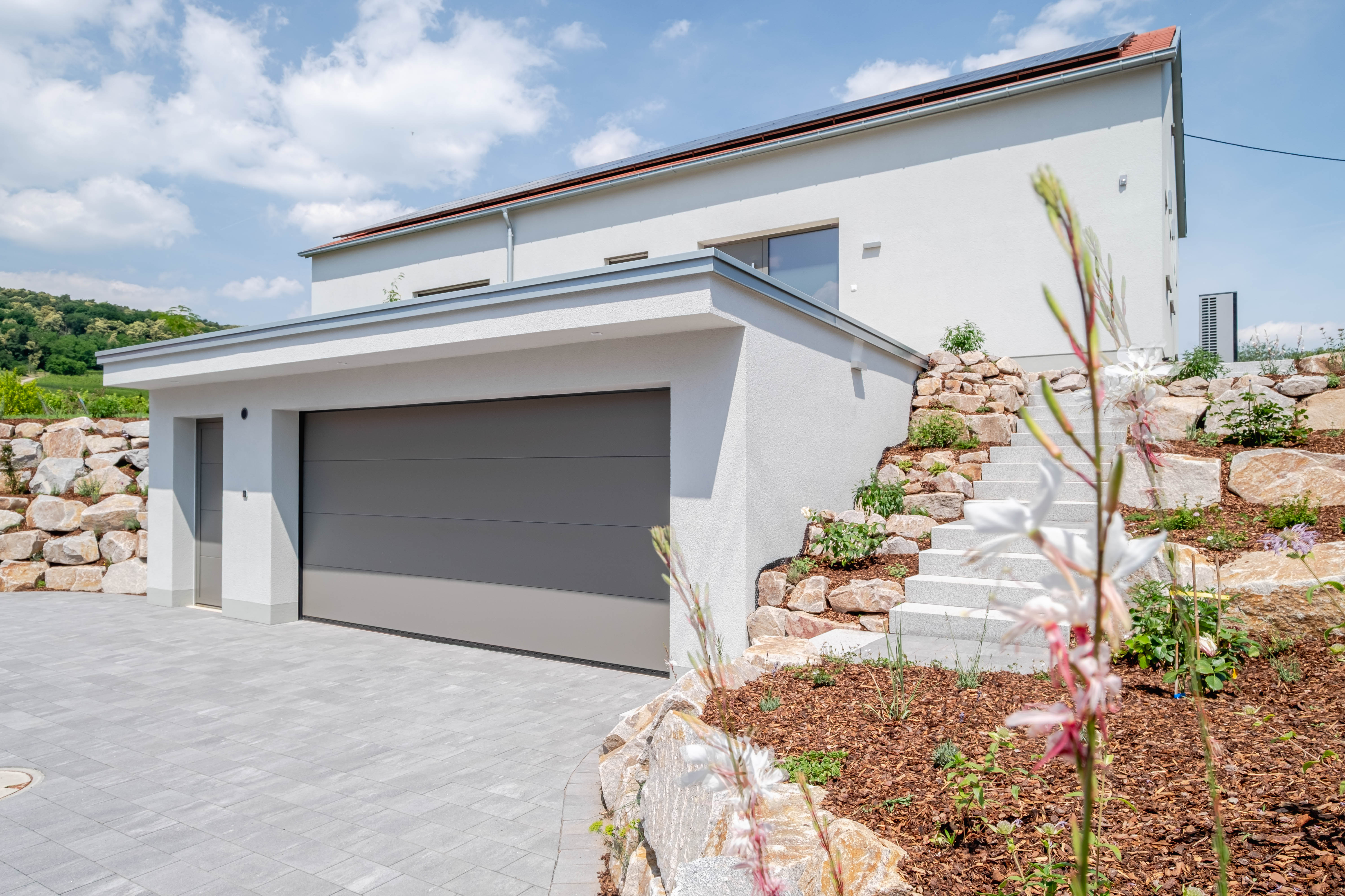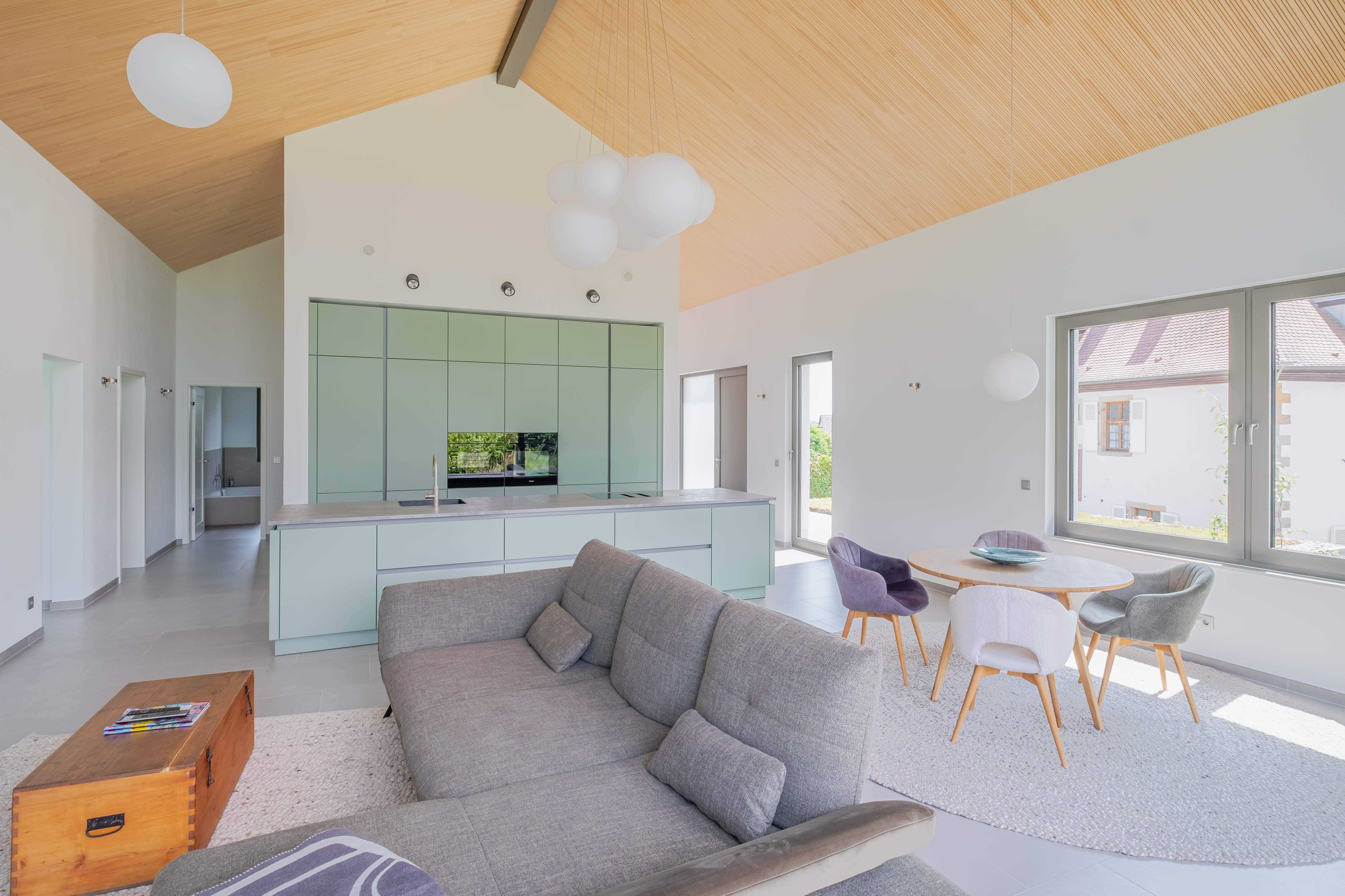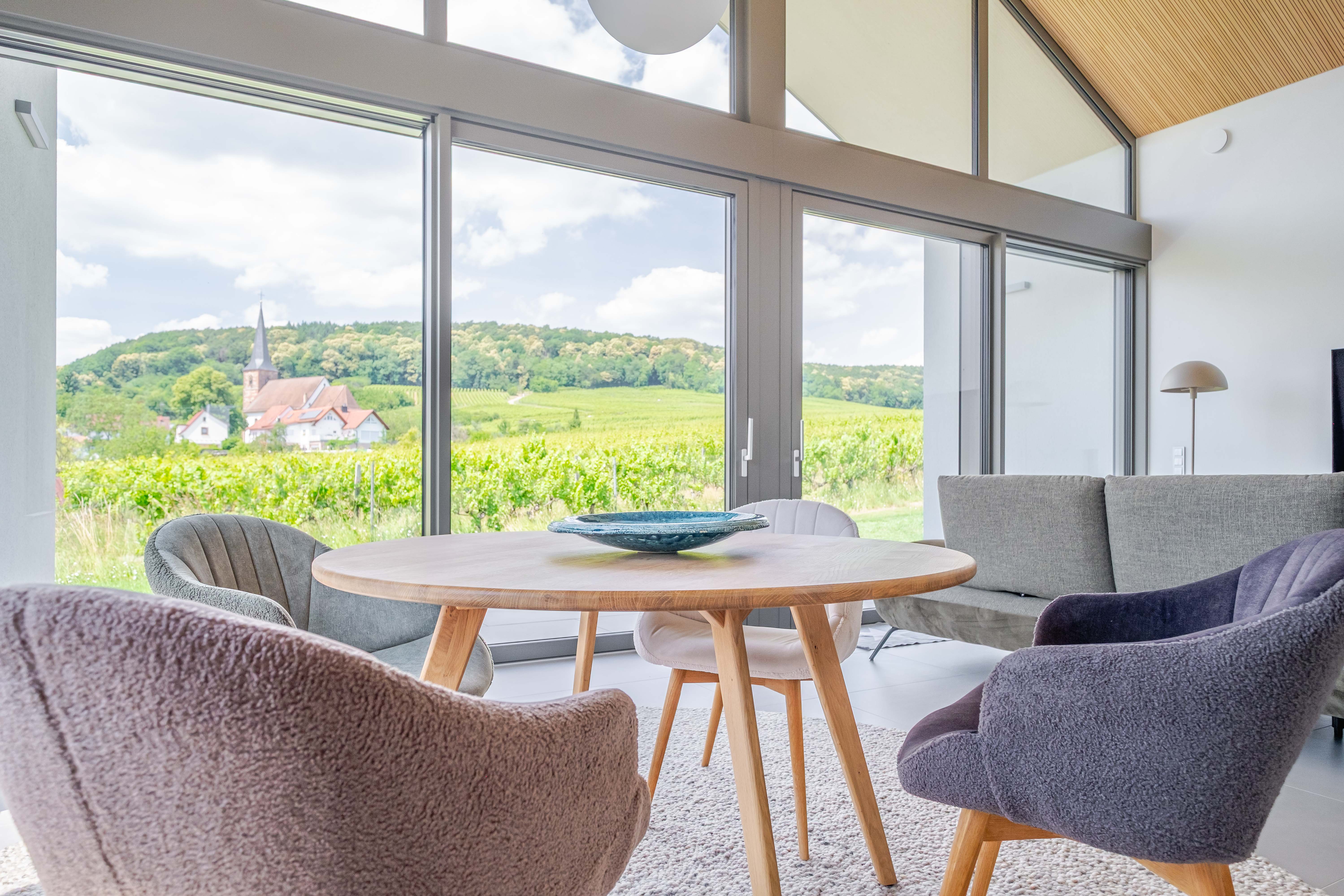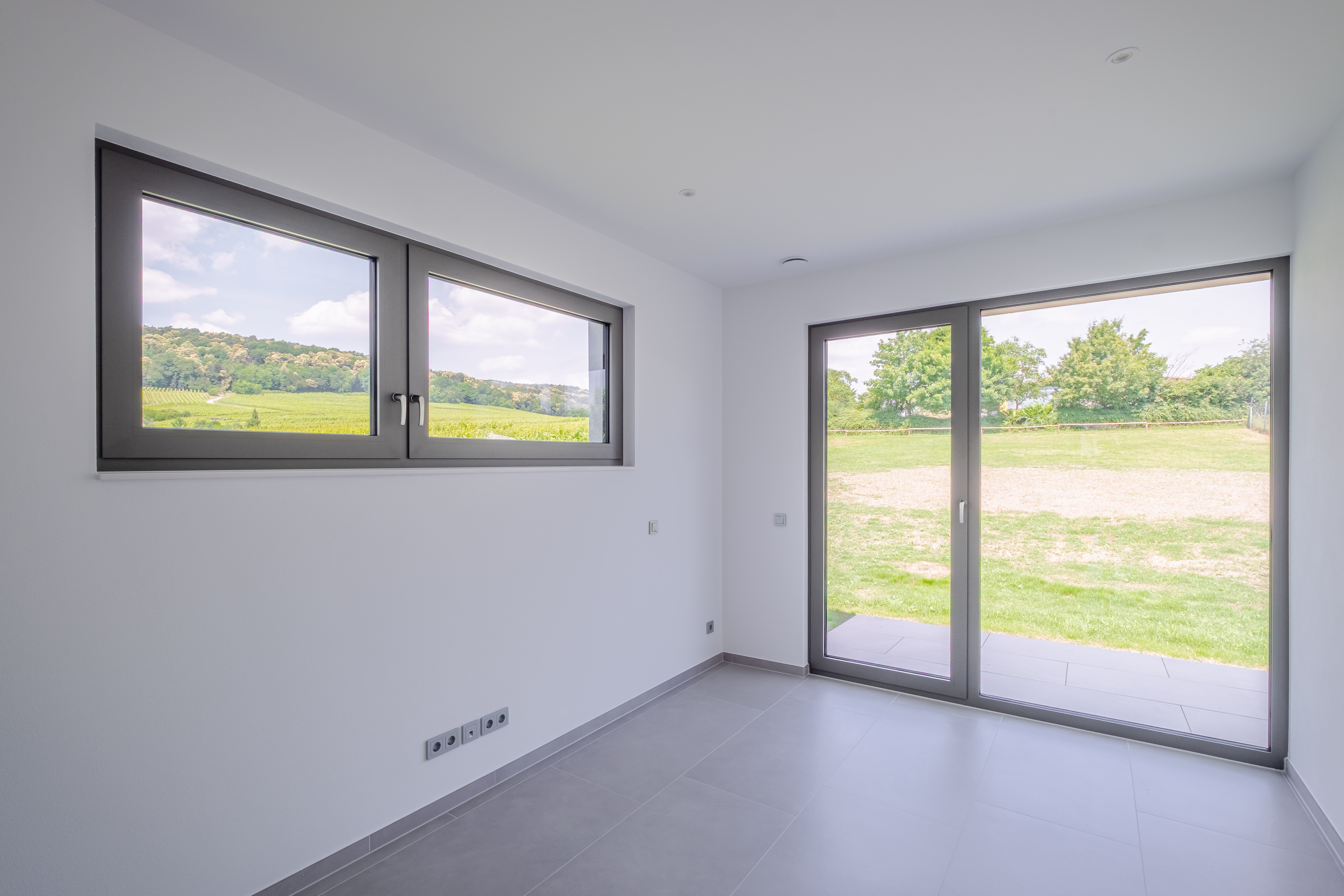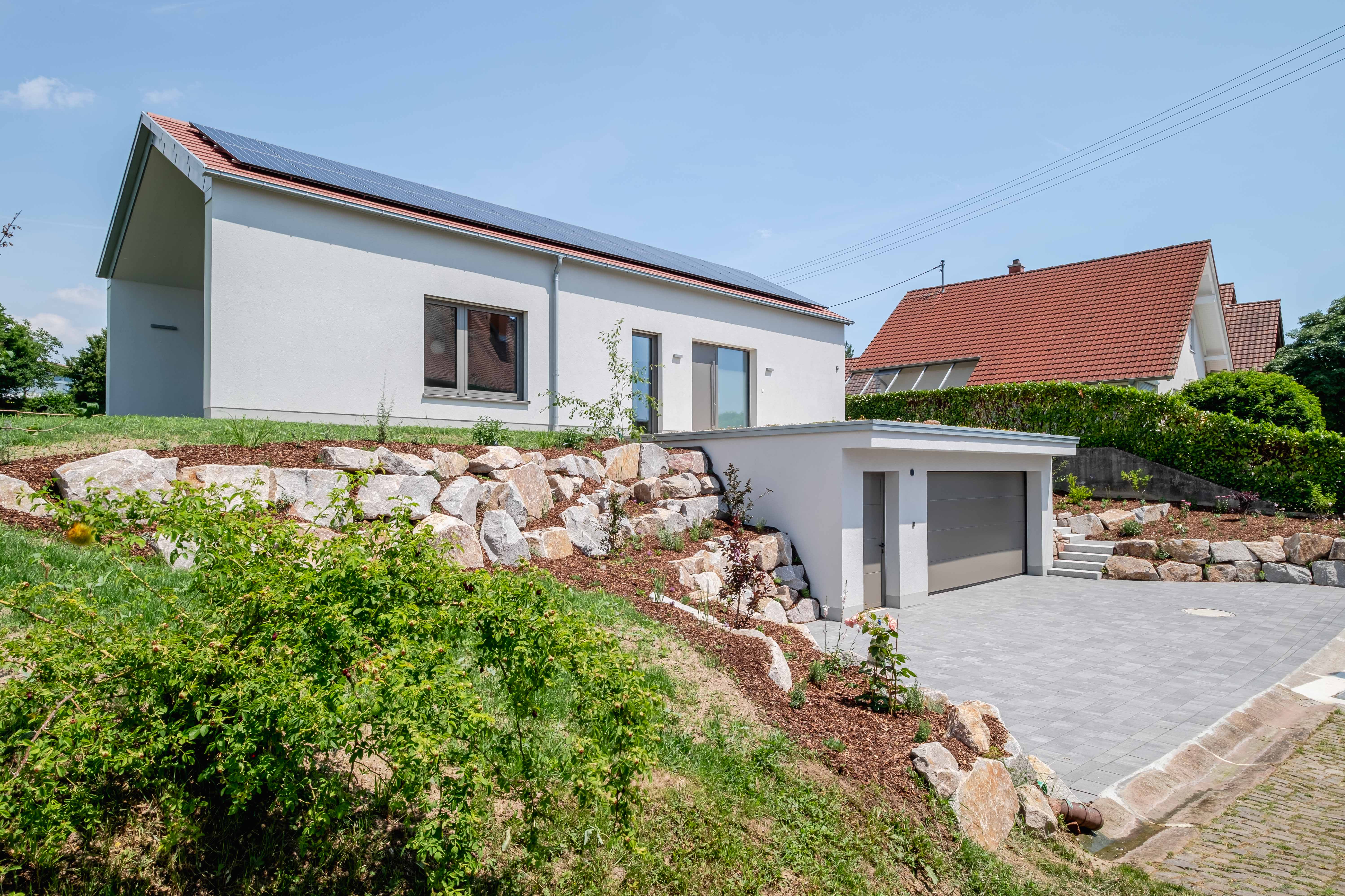 In absolut ruhiger und idyllischer Feldrandlage bietet Ihnen dieser exklusive Neubau-Bungalow die perfekte Symbiose aus moderner Architektur, energieeffizienter Bauweise und hochwertiger Ausstattung. Geplant von renommierten Architekten und gebaut mit lokalen, zuverlässigen Baufirmen, lässt diese Immobilie keine Wünsche offen und entspricht selbst höchsten Erwartungen an Design und Wohnqualität. In einer kaum befahrenen Seitenstraße gelegen, bildet das ca. 1.890 m² große Grundstück in leichter Hanglage viel Platz & Möglichkeiten zur freien Entfaltung – Vorbereitungen für einen Pool sind beispielsweise bereits getroffen worden. Auch eine große Doppelgarage mit zusätzlicher Eingangstür und Vorbereitungen für einen Personenaufzug ist vorhanden, so eignet sich diese Immobilie zum Beispiel auch hervorragend für das barrierearme Wohnen im gehobenen Alter. Einzigartig an dieser Liegenschaft ist der nahtlose Übergang zu den Weinbergen und die grandiose Aussicht – diese können Sie aber nicht nur im Garten genießen! Ein architektonisches Highlight ist der verglaste Giebel mit großen Schiebetüren zur Terrasse hin. In Verbindung mit dem bis zum First hin geöffneten Dachraum, bietet sich ein außergewöhnlicher Raum zum Kochen, Essen und Wohnen mit einem herrlichen Blick ins Grüne und unvergleichlicher Atmosphäre. Die erstklassige Einbauküche mit modernster Technik (Kochfeldabzug von Berbel, Quooker Wasserhahn und Miele Einbaugeräten) lädt zu kulinarischen Genüssen ein und perfektioniert das offene Wohnkonzept zusammen mit dem Ess- und Wohnbereich – all das mit einer hinreißenden Aussicht auf die Weinberge und den Pfälzer Wald! Abgerundet wird der Wohnbereich mit einer großen, durch das vorgezogene Satteldach geschützten, Terrasse. Durch den großen Flur, welcher auch Platz für ein praktisches Büro bietet, erschließt sich das Schlafzimmer mit Ankleide und eigener Terrasse, das Gästezimmer und das große Badezimmer mit bodentiefer Dusche und Badewanne. Außerdem verfügt die Immobilie über ein Gäste-WC und einen großen Hauswirtschafts- und Technikraum. Ein weitläufiger Dachraum dient als zusätzlicher Lagerfläche. Beim Bau wurde Wert auf eine umfassende und moderne Haustechnik gelegt. Eine große Photovoltaikanlage mit Speicher sorgt für geringe Energiekosten, während die Wärmepumpe in Verbindung mit einer Fußbodenheizung und einer kontrollierten Wohnraumlüftung mit Wärmerückgewinnung für absolutes Wohlfühlklima sorgt. In Verbindung mit der hochqualitativen Bauweise und umfangreichen Dämmmaßnahmen ergibt sich Energieeffizienzklasse A+!